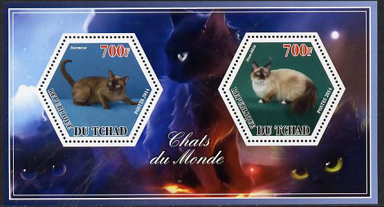 Chad 2014 Cats #3 perf sheetlet containing two hexagonal-shaped values unmounted mint