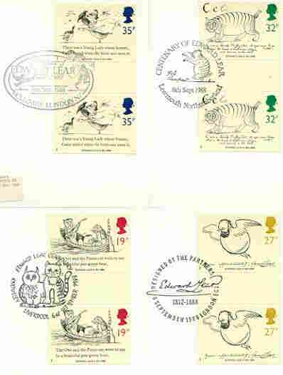 Great Britain 1988 Death Centenary of Edward Lear (Artist & Author) set of 4 PHQ cards with appropriate gutter pairs each very fine used with first day cancels