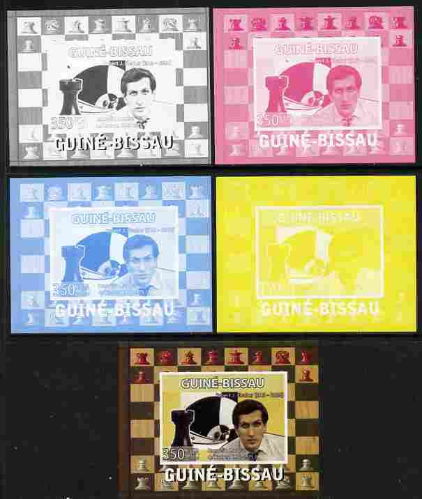 Guinea - Bissau 2008 Chess Champions - Robert Fischer individual deluxe sheetlet - the set of 5 imperf progressive proofs comprising the 4 individual colours plus all 4-colour composite, unmounted mint