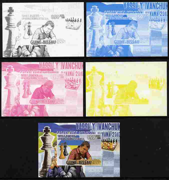 Guinea - Bissau 2010 Chess - Vassily Ivanchuk #1 individual deluxe sheet - the set of 5 imperf progressive proofs comprising the 4 individual colours plus all 4-colour composite, unmounted mint