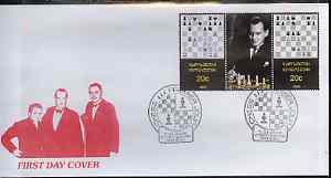 Kyrgyzstan 2000 Alexandre Alekhine #3 perf strip of 3 on illustrated cover with special Chess cancellation