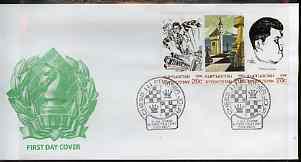Kyrgyzstan 2000 Chess in the 20th Century #2 perf strip of 3 on illustrated cover with special Chess cancellation
