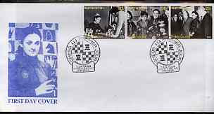 Kyrgyzstan 2000 Chess Personalities #3 perf strip of 3 on illustrated cover with special Chess cancellation