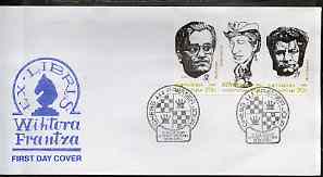 Kyrgyzstan 2000 Greatest Chess Champions (Caricatures) #1 perf strip of 3 on illustrated cover with special Chess cancellation