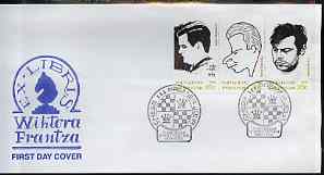 Kyrgyzstan 2000 Greatest Chess Champions (Caricatures) #2 perf strip of 3 on illustrated cover with special Chess cancellation