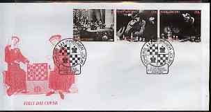 Kyrgyzstan 2000 History of Chess #3 perf strip of 3 on illustrated cover with special Chess cancellation