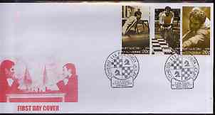 Kyrgyzstan 2000 Karpov & Kasparov (Chess) #2 perf strip of 3 on illustrated cover with special Chess cancellation