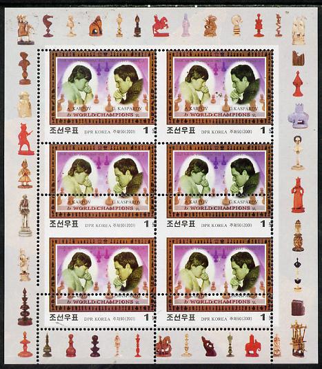 North Korea 2001 Chess World Champions 1wn (Karpov & Kasparov) sheetlet of 6 with 6 misplaced strikes of the perf comb, unusual and spectacular item, unmounted mint