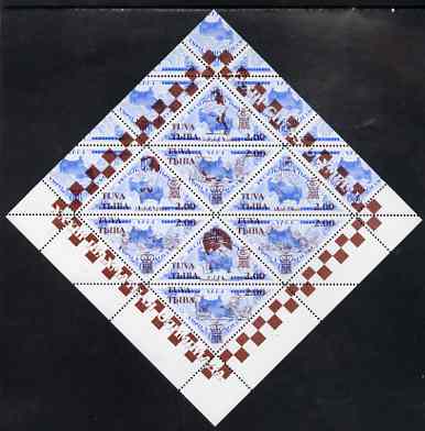 Touva 1998 33rd Chess Olympiad overprint #1 on 1994 Yak (2.00 on 100r blue) triangular perf sheet of 8 unmounted mint