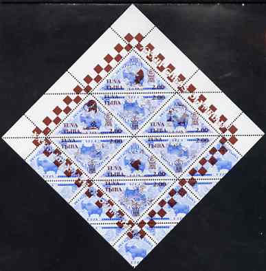 Touva 1998 33rd Chess Olympiad overprint #5 on 1994 Yak (2.00 on 100r blue) triangular perf sheet of 8 unmounted mint