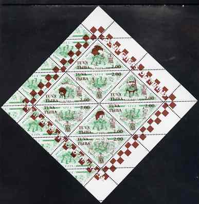 Touva 1998 33rd Chess Olympiad overprint #7 on 1994 Wrestlers (2.00 on 300r green) triangular perf sheet of 8 unmounted mint