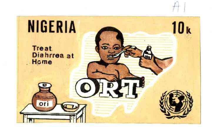 Nigeria 1986 UN's Children's Fund - original hand-painted artwork for 10k value (showing Oral Rehydration Therapy) by Godrick N Osuji on card 220 x 125mm endorsed A1