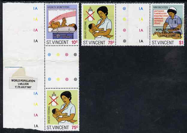 St Vincent 1987 Child Health two se-tenant gutter pairs (folded through gutters) one stamp in each with Paste-up for World Population overprint - Ex uncut archive proof sheet, almost certainly unique