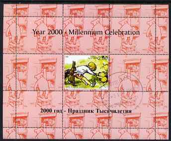 Tadjikistan 1999 Winnie the Pooh perf sheetlet #1 containing 1 stamp & 8 labels (red background colour), unmounted mint