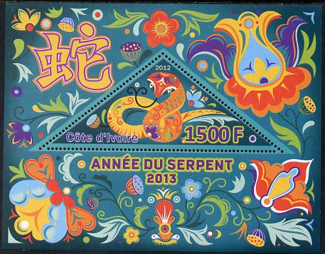 Ivory Coast 2012 Chinese New Year - Year of the Snake perf m/sheet containing triangular shaped 1500F value unmounted mint