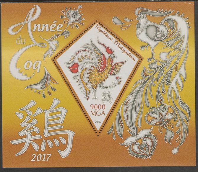 Madagascar 2016 Lunar New Year - Year of the Rooster perf deluxe sheet containing one diamond shaped value unmounted mint