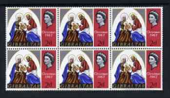 Gibraltar 1967 Christmas 2d unmounted mint plate block of 6, one stamp with 'Bracelet Flaw' SG 217 V17