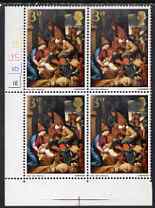 Great Britain 1967 Christmas 3d (Adoration by School of Seville) corner cyl block of 6 with dry print of gold affecting the value & Queen's Head on 3 stamps, unmounted mint but slight signs of staining, SG 756var
