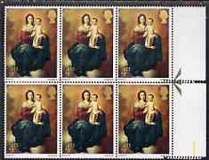 Great Britain 1967 Christmas 4d (Murillo) marginal block of 6 with double perfs, separated into 2 strips of 3 and rejoined with hinges, SG 757var