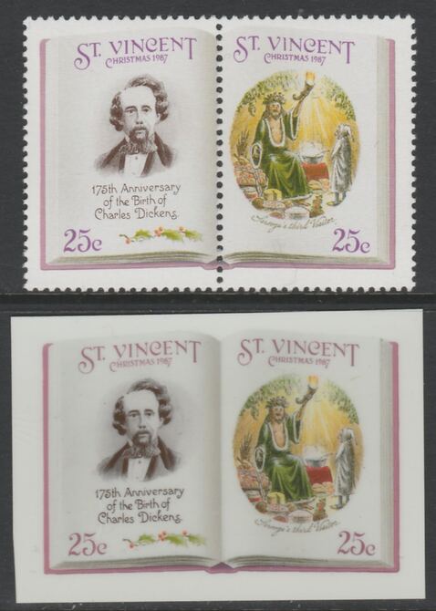 St Vincent 1987 Christmas - Charles Dickens 25c Scrooge's Third Visitor se-tenant die proof in all 4 colours on Cromalin plastic card (ex archives) complete with issued pair (SG 1118a). Cromalin proofs are an essential part of the printing proces, produced in very limited numbers and rarely offered on the open market.