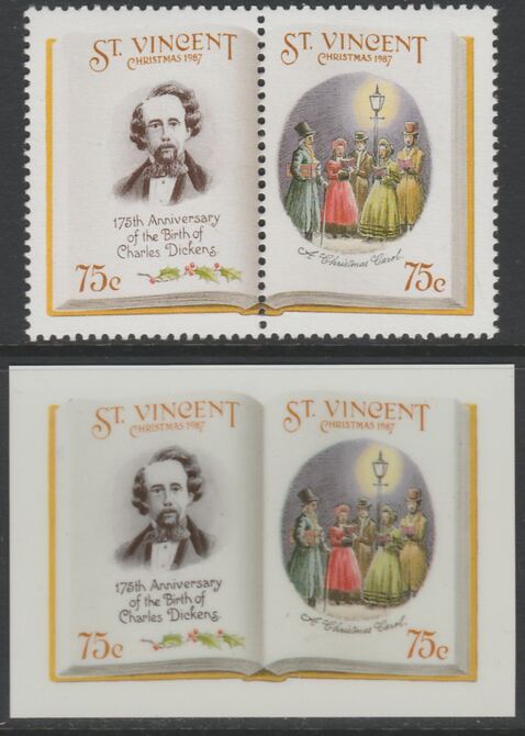 St Vincent 1987 Christmas - Charles Dickens 75c A Christmas Carol se-tenant die proof in all 4 colours on Cromalin plastic card (ex archives) complete with issued pair (SG 1122a). Cromalin proofs are an essential part of the printing proces, produced in very limited numbers and rarely offered on the open market.