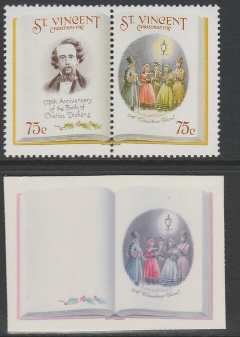 St Vincent 1987 Christmas - Charles Dickens 75c A Christmas Carol se-tenant die proof in magenta & cyan only on Cromalin plastic card (ex archives) complete with issued pair (SG 1122a). Cromalin proofs are an essential part of the……Details Below