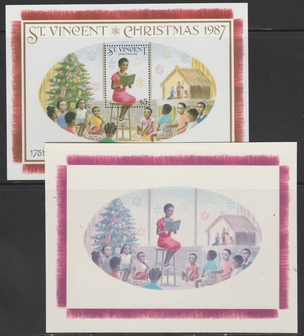 St Vincent 1987 Christmas (Charles Dickens) m/sheet (Teacher reading to Class) die proof in red and blue only (missing Country name & value) on Cromalin plastic card (ex archives) plus issued m/sheet,SG MS 1124