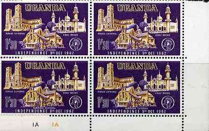 Uganda 1962 Independence 1s30 unmounted mint plate block of 4 showing large flaw by dome of Cathedral, SG 106var