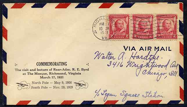 United States 1931 Commemorative cover for visit of Rear-Adm Byrd to Richmond Mosque