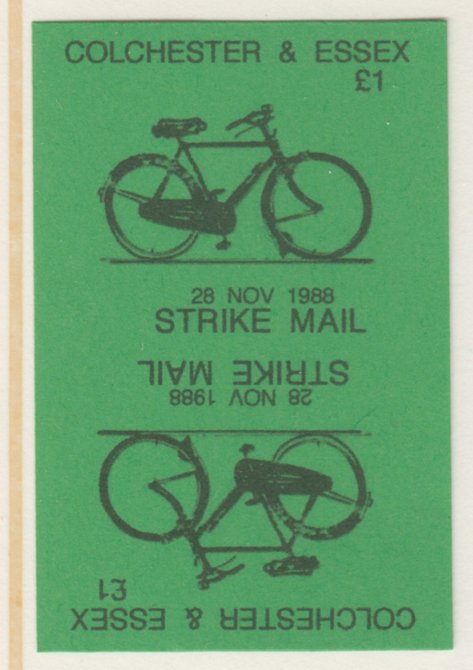 Cinderella - Great Britain 1988 Colchester & Essex £1 Strike Mail label black on green showing Bicycle and dated 28 Nov 1988 imperf tete-beche proof pair on ungummed paper
