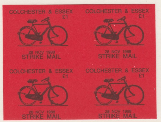 Cinderella - Great Britain 1988 Colchester & Essex £1 Strike Mail label black on red showing Bicycle and dated 28 Nov 1988 imperf proof block of 4 on ungummed paper