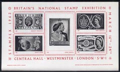 Exhibition souvenir sheet for 1962 National Stamp Exhibition showing Great Britain stamps (12,000 produced by Harrison & Sons) unmounted mint