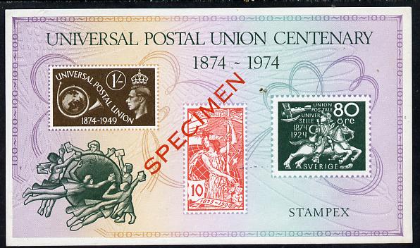 Exhibition souvenir sheet for 1974 Stampex commemorating the UPU Centenary and,showing UPU designs, overprinted SPECIMEN unmounted mint