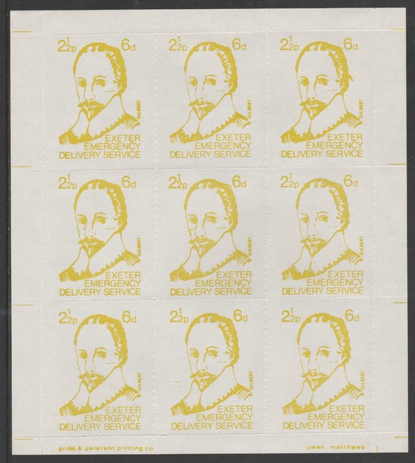 Great Britain 1971 Exeter Emergency Delivery Service 2.5p-6d label depicting Gilbert in complete sheet of 9 unmounted mint
