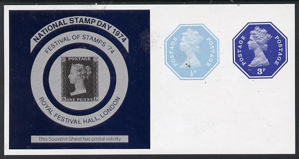 Great Britain 1974 National Stamp Day postally valid Exhibition sheet containing Octagonal Machin 1/2p & 3p with reproduction of 1d black unmounted mint
