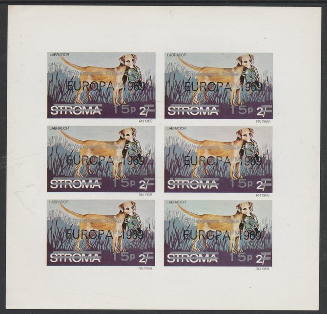 Stroma 1971 Dogs 15p on 2s (Labrador) overprinted 'Emergency Strike Post' for use on the British mainland unmounted mint complete imperf sheet of 6