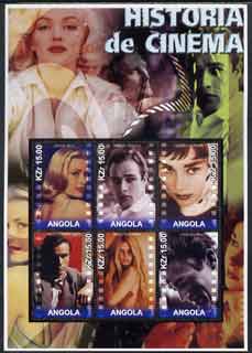 Angola 2002 History of the Cinema #04 large perf sheetlet containing set of 6 values unmounted mint (Grace Kelly, Marlon Brando, Audrey Hepburn, Montgomery Clift, Brigitte Bardot & James Dean)