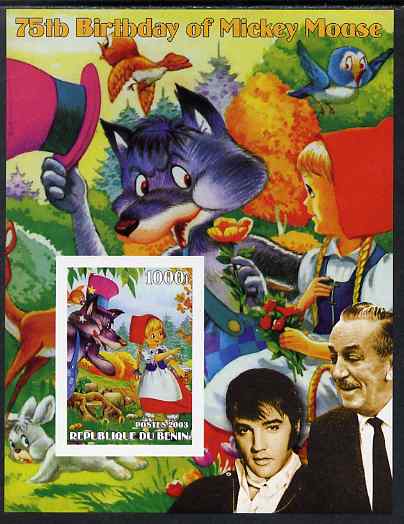 Benin 2003 75th Birthday of Mickey Mouse - Little Red Riding Hood #01 (also shows Elvis & Walt Disney) imperf m/sheet unmounted mint. Note this item is privately produced and is offered purely on its thematic appeal