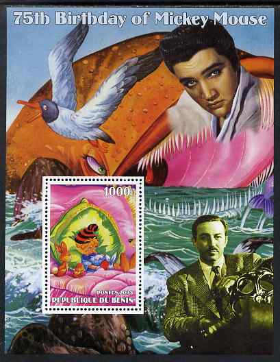 Benin 2003 75th Birthday of Mickey Mouse - Pinocchio #01 (also shows Elvis & Walt Disney) perf m/sheet unmounted mint. Note this item is privately produced and is offered purely on its thematic appeal