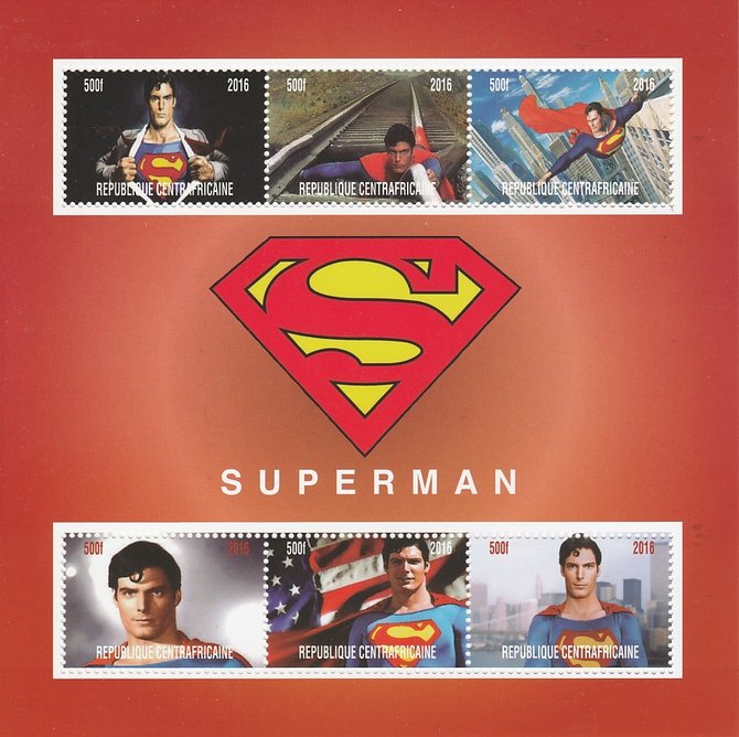 Central African Republic 2016 Superman perf sheetlet containing 6 values unmounted mint. Note this item is privately produced and is offered purely on its thematic appeal