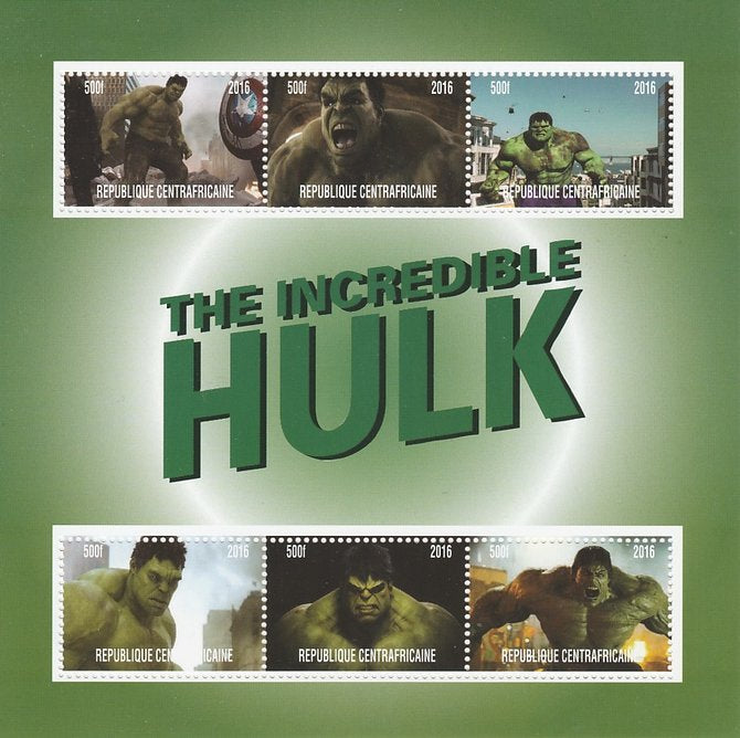 Central African Republic 2016 The Incredible Hulk perf sheetlet containing 6 values unmounted mint. Note this item is privately produced and is offered purely on its thematic appeal