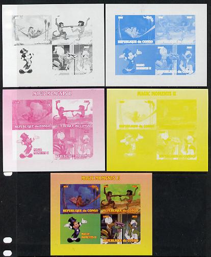 Congo 2013 Disney - Magic Moments #2 sheetlet containing 3 values plus,the set of 5 imperf progressive colour proofs comprising the 4 basic colours plus all 4-colour composite unmounted mint