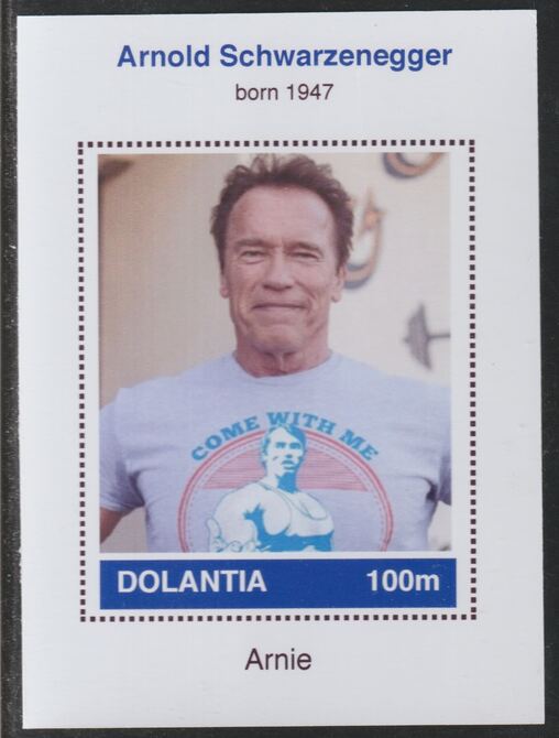 Dolantia (Fantasy) Arnold Schwarzenegger imperf deluxe sheetlet on glossy card (75 x 103 mm) unmounted mint