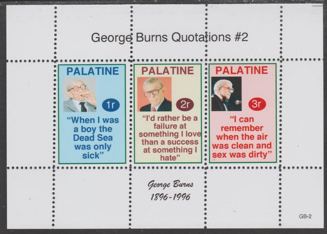 Palatine (Fantasy) Quotations by George Burns #2 perf deluxe glossy sheetlet containing 3 values each with a famous quotation,unmounted mint