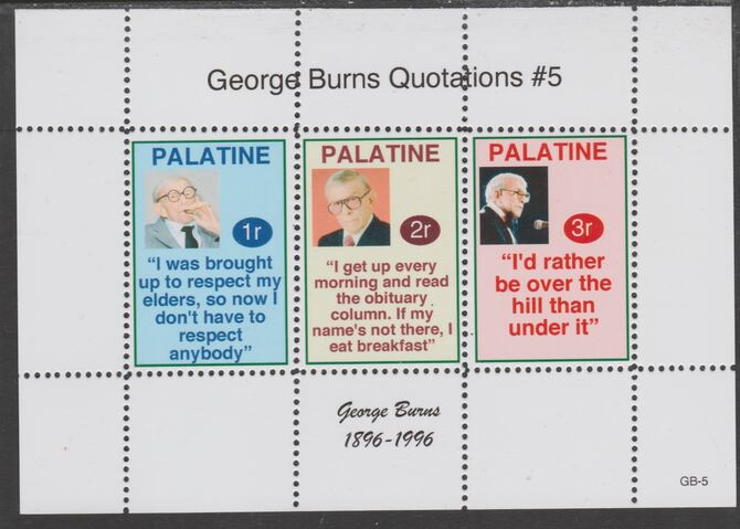 Palatine (Fantasy) Quotations by George Burns #5 perf deluxe glossy sheetlet containing 3 values each with a famous quotation,unmounted mint