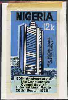 Nigeria 1979 International Radio Committee - original hand-painted artwork for 12k value (Necom Tower) by Godrick N Osuji similar to issued stamp on card 4.5" x 7.5" with overlay endorsed B1