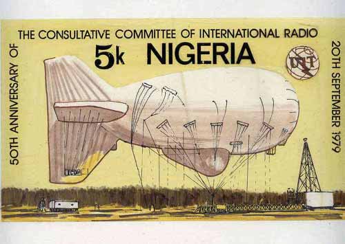 Nigeria 1979 International Radio Committee - original hand-painted artwork for 5k value (Showing Radio Airship) on card 9" x 5" with overlay