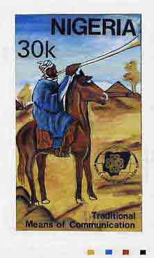 Nigeria 1983 World Communications Year - original hand-painted artwork for 30k value (Town Cryer on Horseback) by Mrs A Adeyeye on board 5" x 8.5", endorsed C1