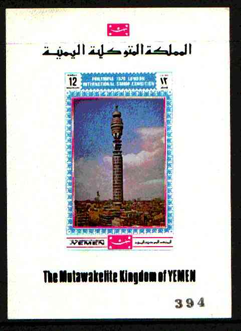 Yemen - Royalist 1970 'Philympia 70' Stamp Exhibition 12B Telecom Tower (Post Office Tower) imperf individual de-luxe sheet (as Mi 1035) unmounted mint