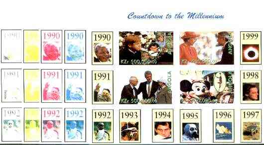 Angola 1999 Countdown to the Millennium #10 (1990-1999) sheetlet containing 4 values (Elton John & Diana, Senna, Euro-Disney, Queen & Peace in Middle East) the set of 5 imperf progressive proofs comprising various 2,3 & 4-colour c……Details Below
